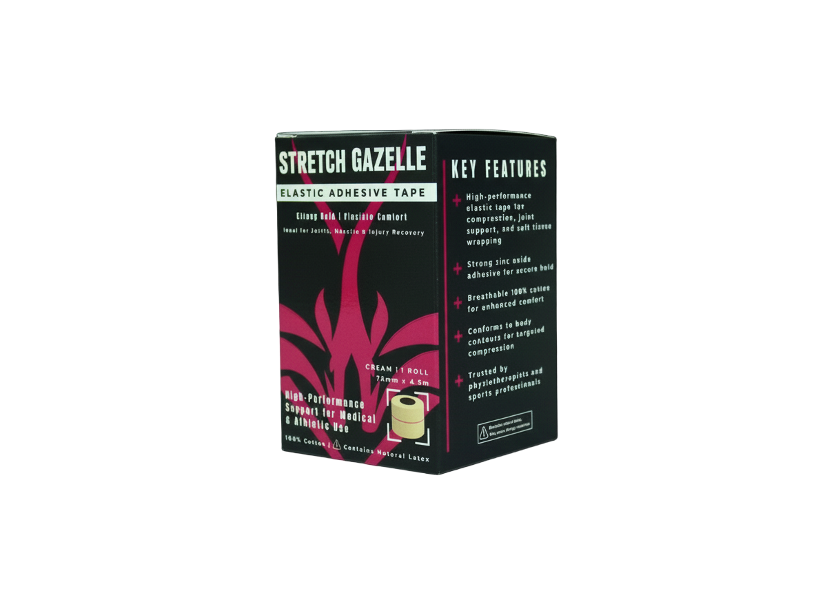 Stretch Gazelle Elastic Adhesive Bandage is a durable, non-stretch cotton tape designed to stabilize joints, limit movement, and protect against sports injuries. Coated with strong zinc oxide adhesive, it delivers firm compression and lasting hold, even during intense activity. Breathable, comfortable, and trusted in medical and athletic settings.